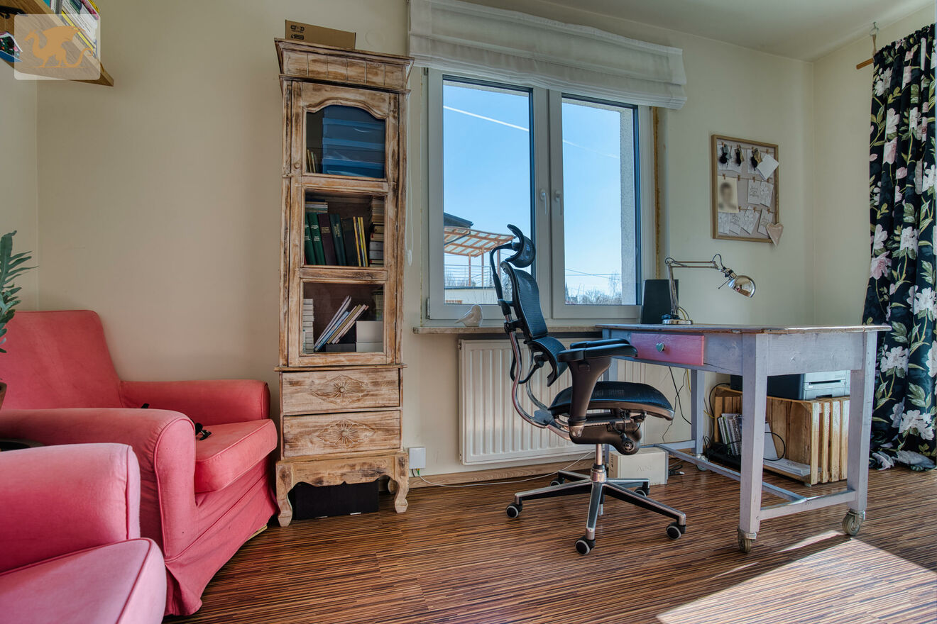 Dom oferuje również bardzo praktyczny układ dla rodziny. Osobny gabinet może pełnić funkcję miejsca do pracy zdalnej, pokoju gościnnego lub dodatkowej sypialni. Garderoby przy sypialniach poprawiają komfort przechowywania, a strych do adaptacji daje możliwość stworzenia kolejnej funkcjonalnej przestrzeni w zależności od potrzeb przyszłego właściciela.